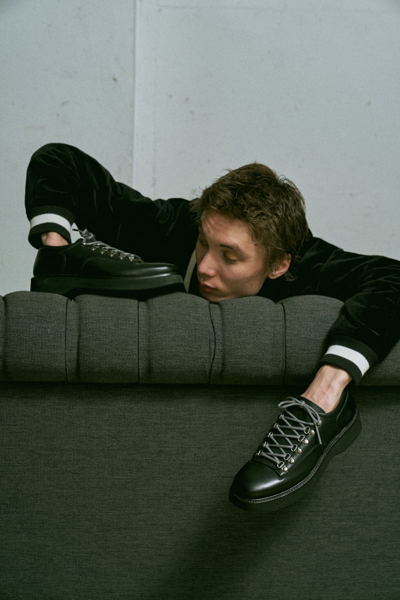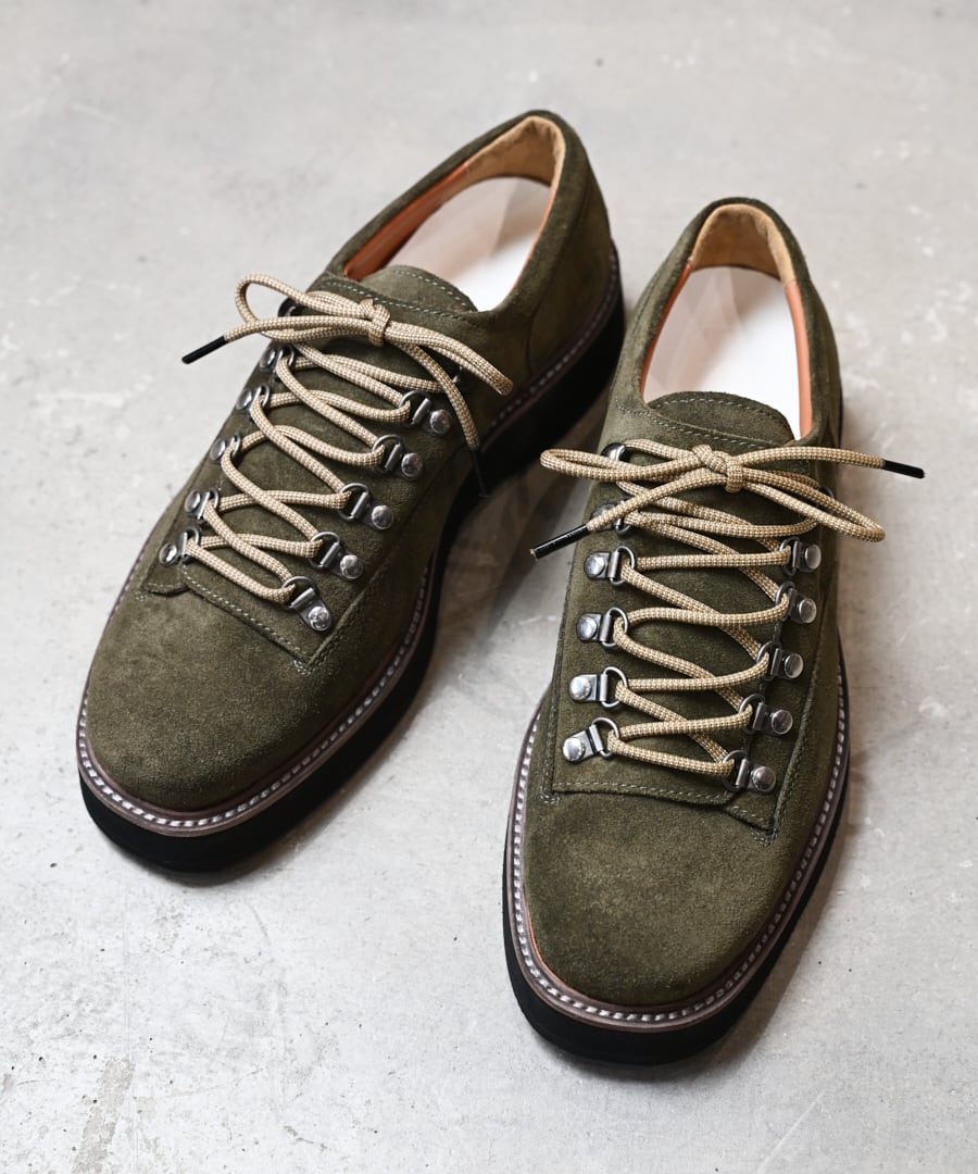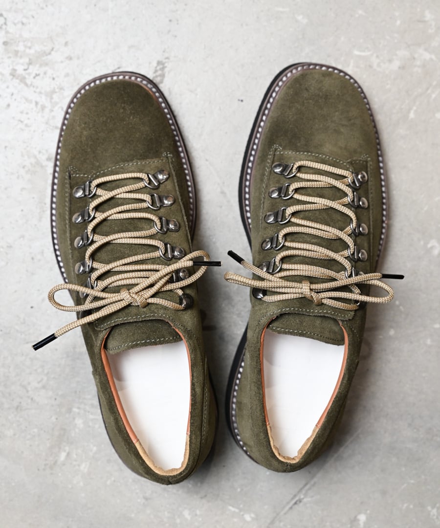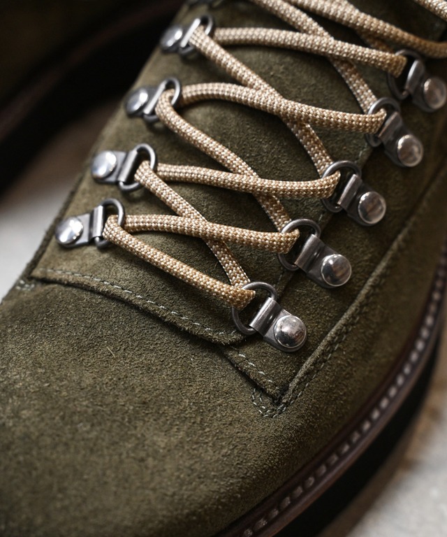 甲部分の重なったレザーとフック使いのディティールが特徴のシューカッティングのマウンテンシューズ。