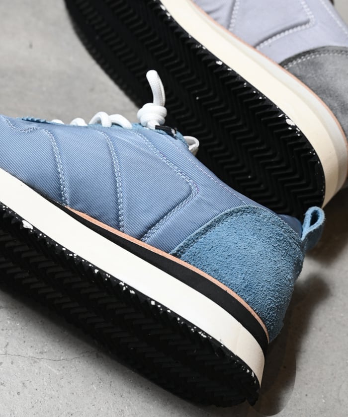 牛スエードレザーに日本製の生地感の特殊な高品質ナイロンを 合わせたアッパーを使用し、 アウトソールにはレトロ感を意識し ブラックのラバー素材にホワイトの廃材で模様柄にミックスさせた オリジナルの小柄のシャークソールを。